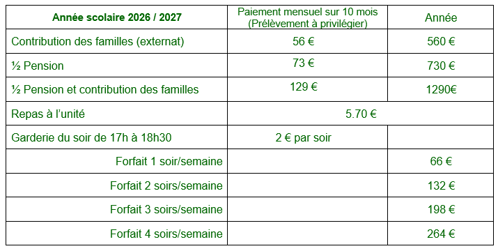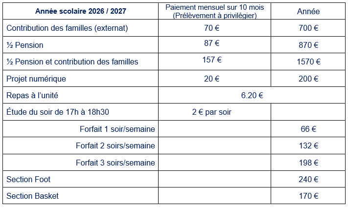 La facture est annuelle : Pour les frais de demi-pension, un avoir sera fait pour toute absence supérieure à 5 jours sur présentation d’un certificat médical. Sur votre facture apparaîtra le montant des fichiers et des livres de littérature qui sont fournis par l’établissement et les séances de piscine.