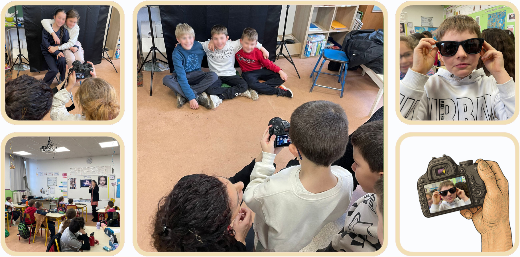 Lors du deuxième temps, les enfants sont passés à la pratique : chacun a pu, tour à tour, être photographe ou modèle. Ce travail leur a permis de réfléchir au cadrage, au point de vue et à l’intention derrière une photo, tout en développant leur regard et leur créativité.