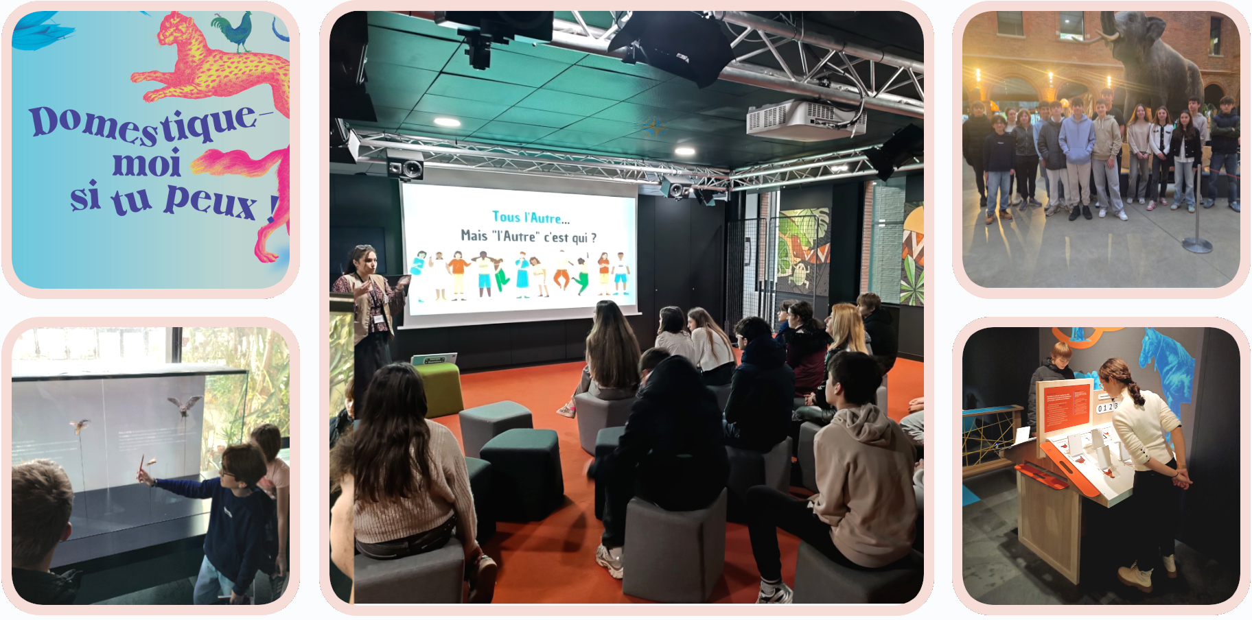 La matinée a été consacrée à un atelier sur le thème "Tous l'Autre" pour comprendre comment des théories scientifiques ont servi autrefois à la construction du racisme. L'après midi a permis de parcourir l'exposition permanente du Muséum, une immersion dans le vaste monde du vivant, à la découverte de la Terre et de ses habitants, ainsi que de passer un long moment dans l'exposition temporaire "Domestique-moi si tu peux".